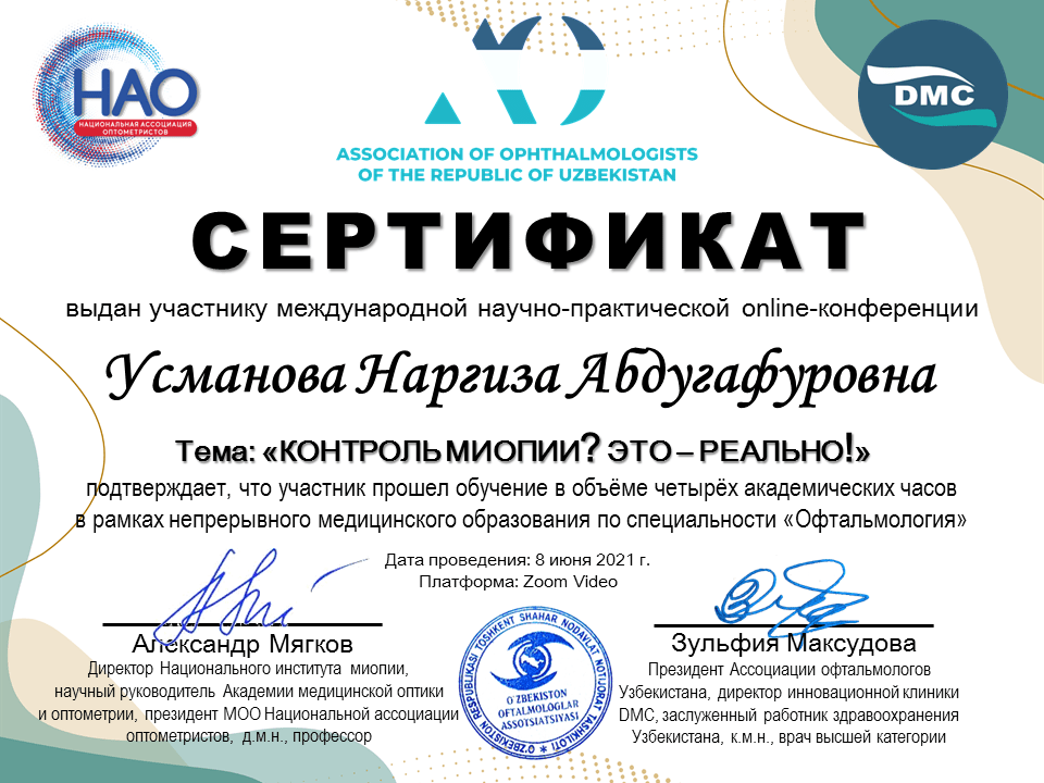 2012-2014 yillarda Oftalmologiya bo’yicha Respublika ixtisoslashtirilgan ko’z mikroxirurgiyasi markazida rezidentlik. Faxriy yorliq.